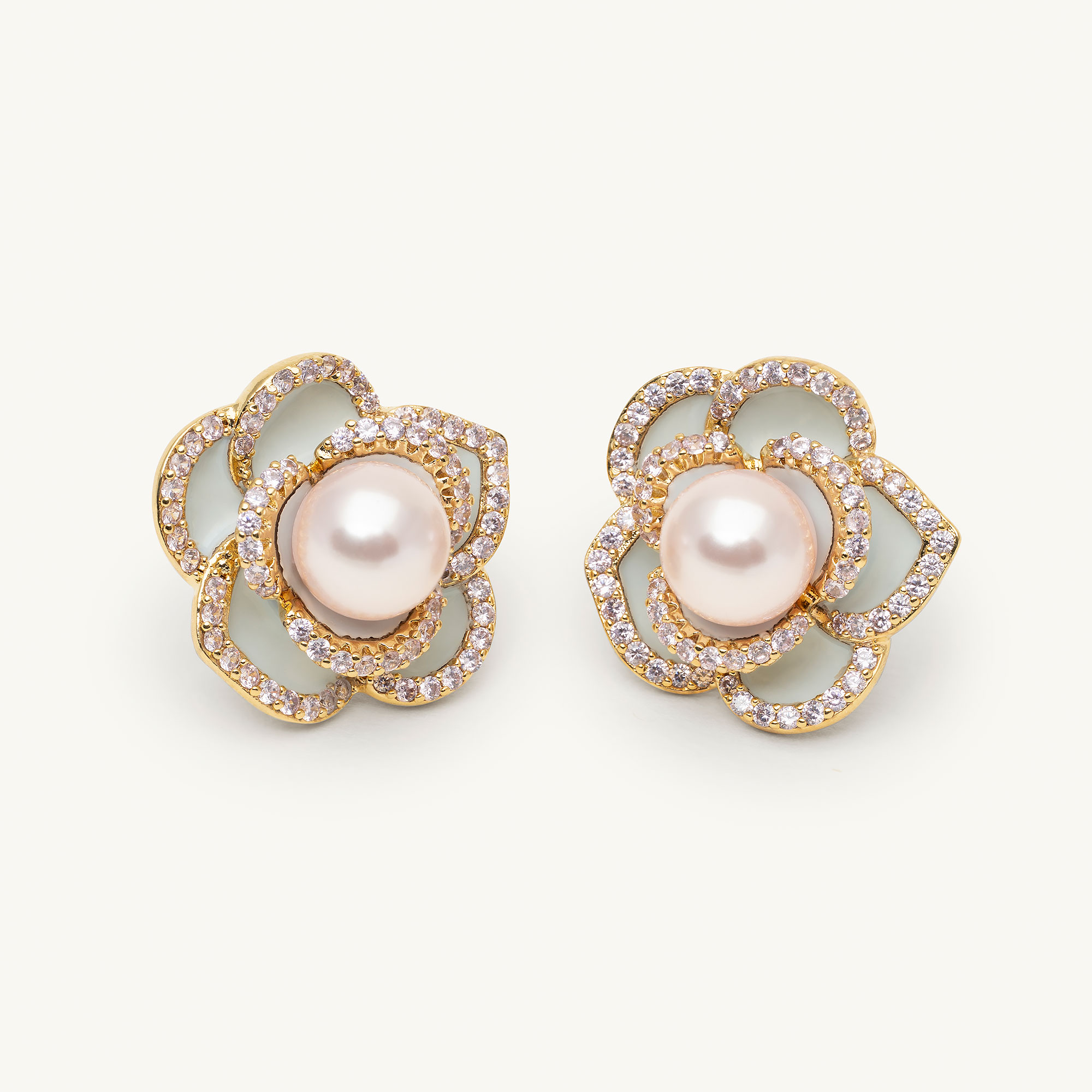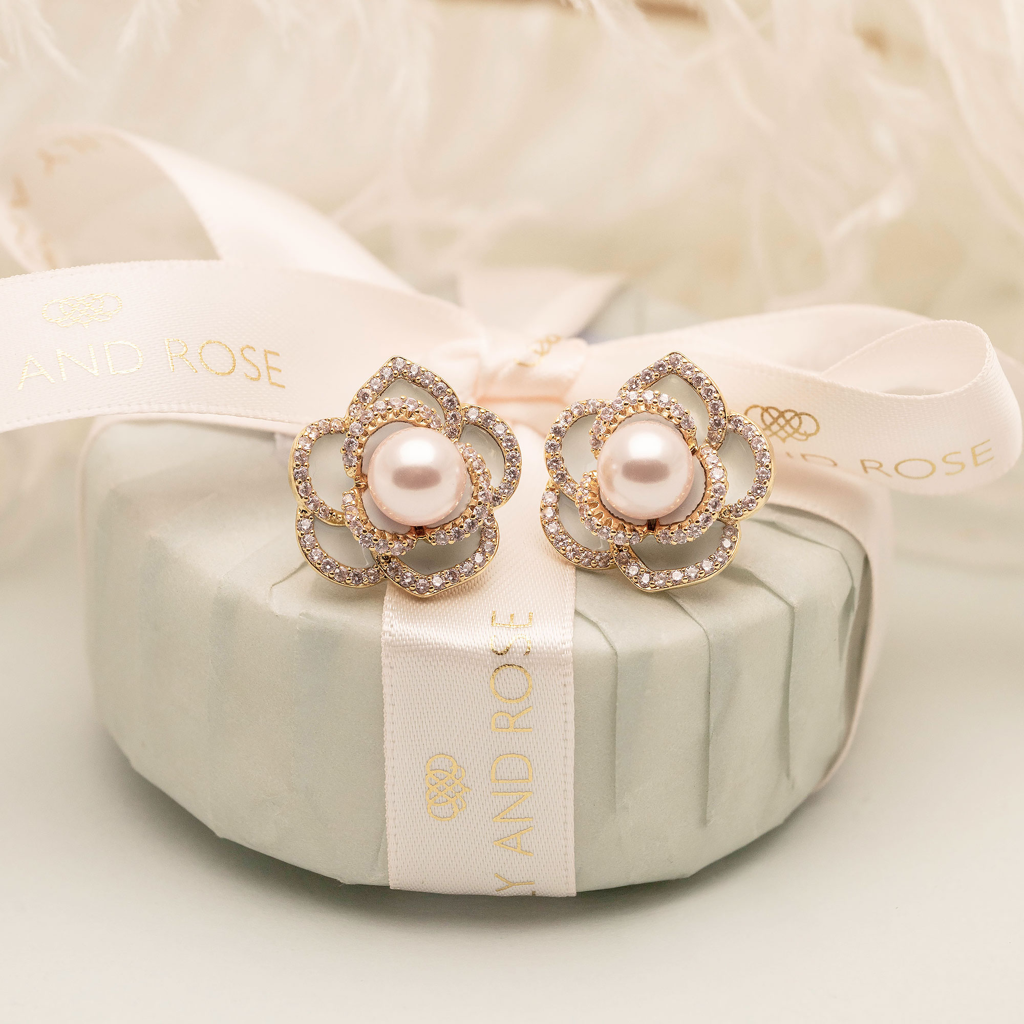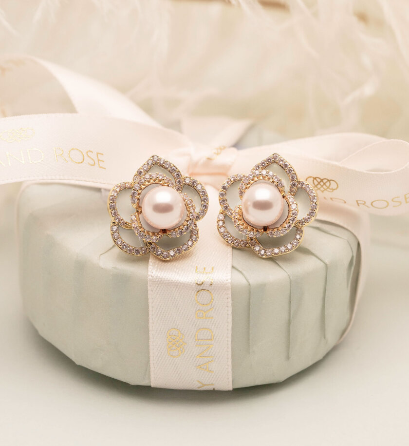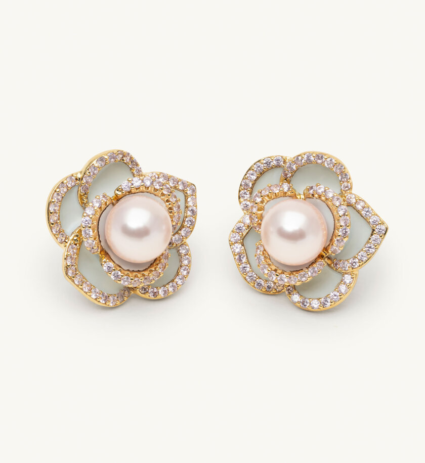 Our Coco rose earrings showcase a striking rose design in gold, light blue and celestial pink. A perfect accessory for those who love timeless beauty with a modern twist.
