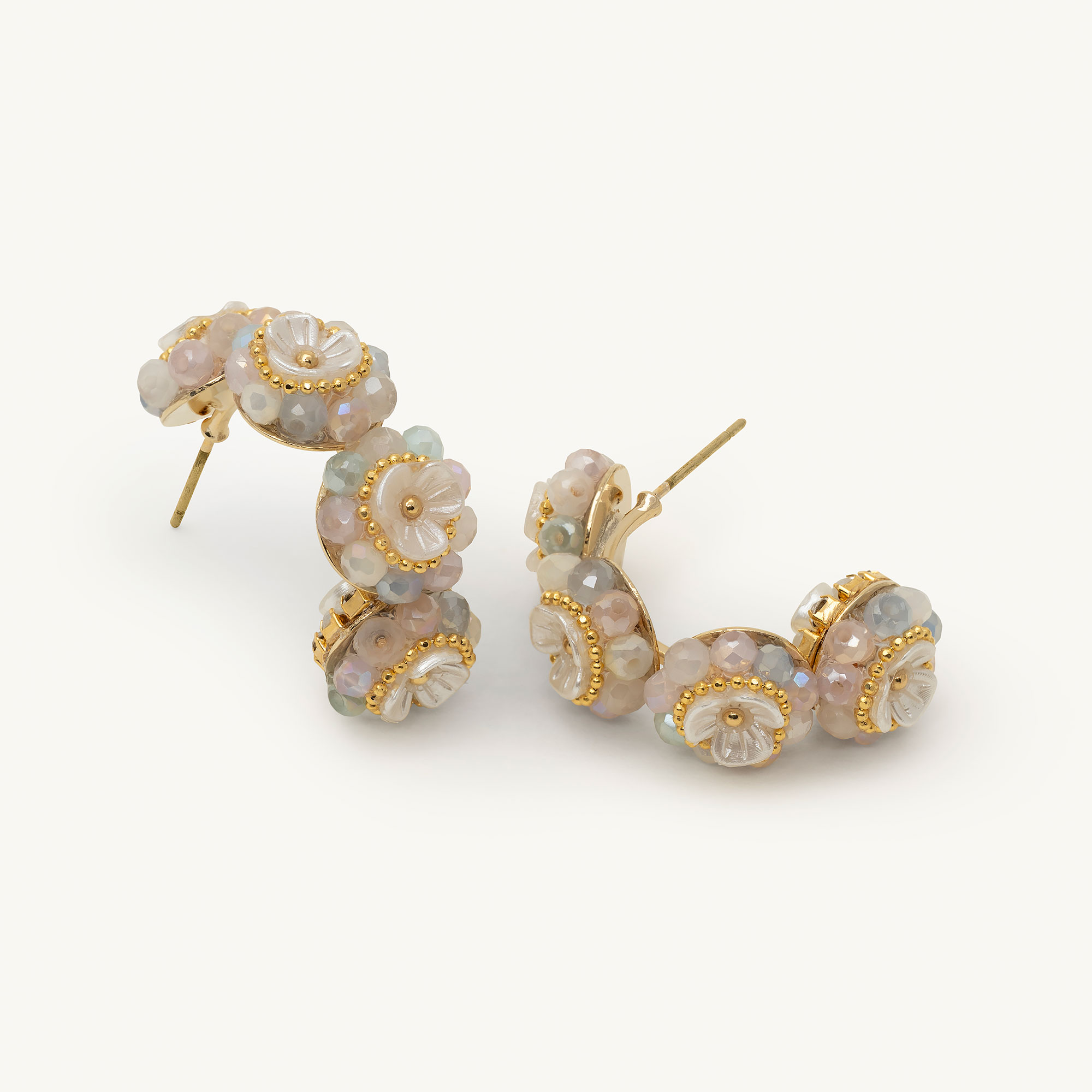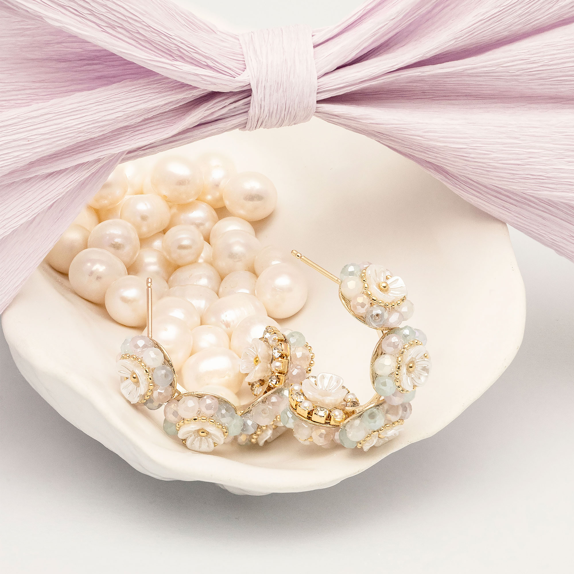 These hoops are perfect for fashion-forward individuals who love to mix whimsy with sophistication. Playful floral motifs in white combined with soft pastel colored beads.